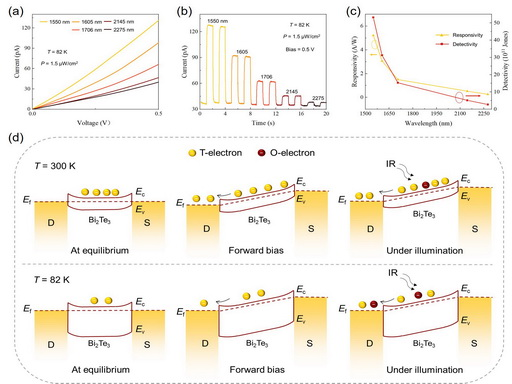 图2 Bi2Te3光电探测器的a I-V曲线;b I-t曲线;c响应度和比探测率;d能带示意图