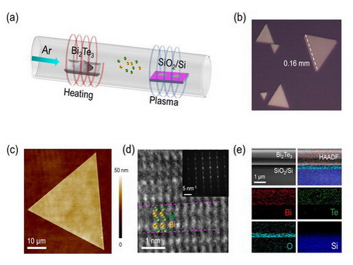 图1 二维Bi2Te3单晶的a生长示意图;b光镜图;c AFM图;d HRTEM图;e EDS图
