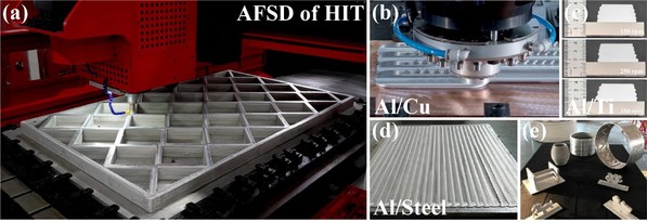 图2 团队自主研发的AFSD设备及米级大尺寸铝/钢、铝/钛、铝/铜等复合材料