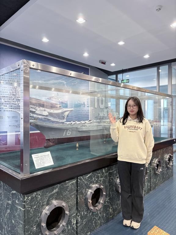 实践中,她系统探访博物馆九大展区,从郑和宝船的古代智慧,到致远舰的近代悲怆,再到辽宁舰、“蛟龙”号等国之重器的现代辉煌,细致记录展品资料、深挖船舶科技内涵。她以青少年视角为切入点,将专业术语转化为生动故事,让船舶知识变得通俗易懂。